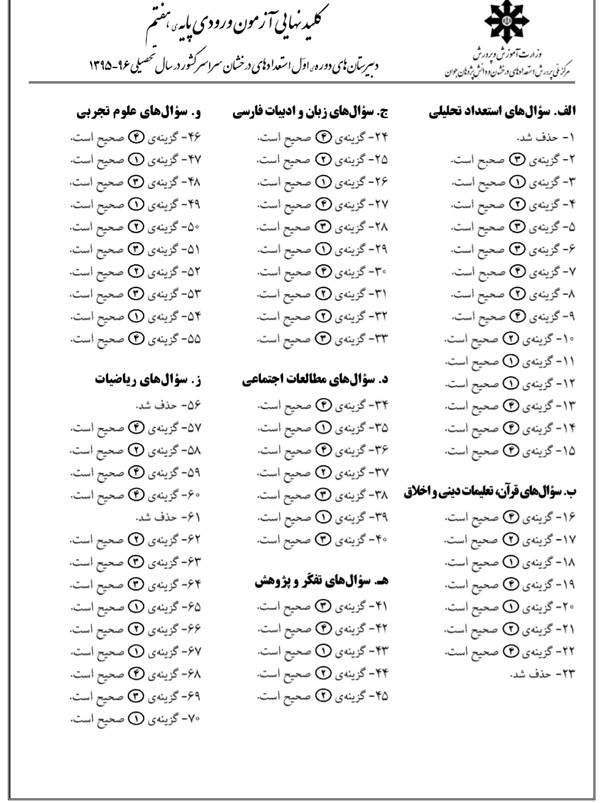 نمونه سوالات آزمون تیزهوشان نهم به دهم